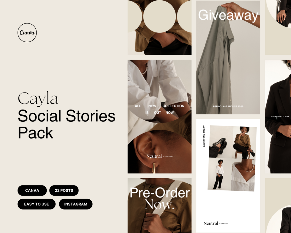 Cayla Social Stories Pack by Studio Provo is created in Canva and features a minimalist aesthetic, perfect for fashion brands, fashion influencers, and fashion studios. The pack includes 22 unique templates in 1080x1920 pixels.